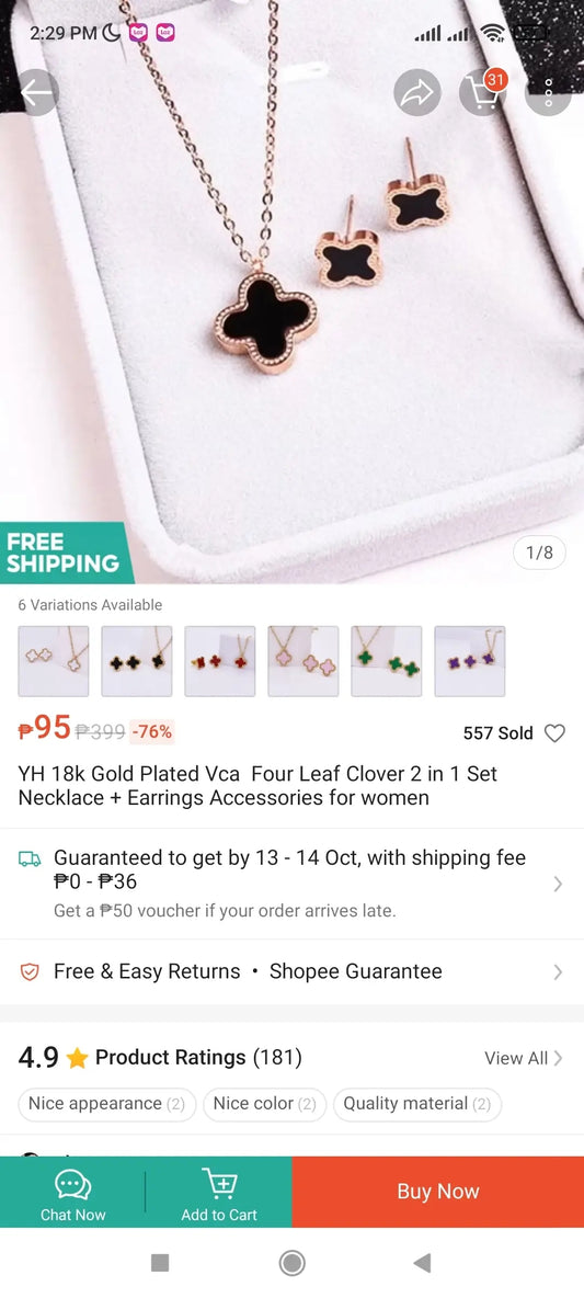 VCA 2 in 1 Jewelry Set Necklace & Earring 4-Leaf Clover w/ Color Box